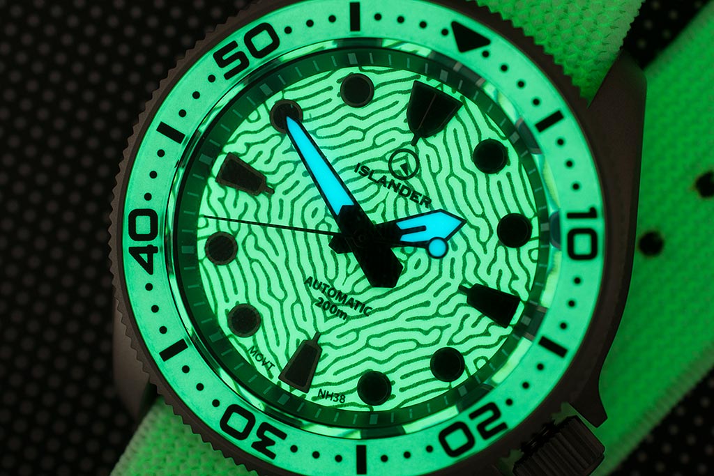 Unlike a Seiko, the coin-edged crown is signed, in this case with the Islander logo.